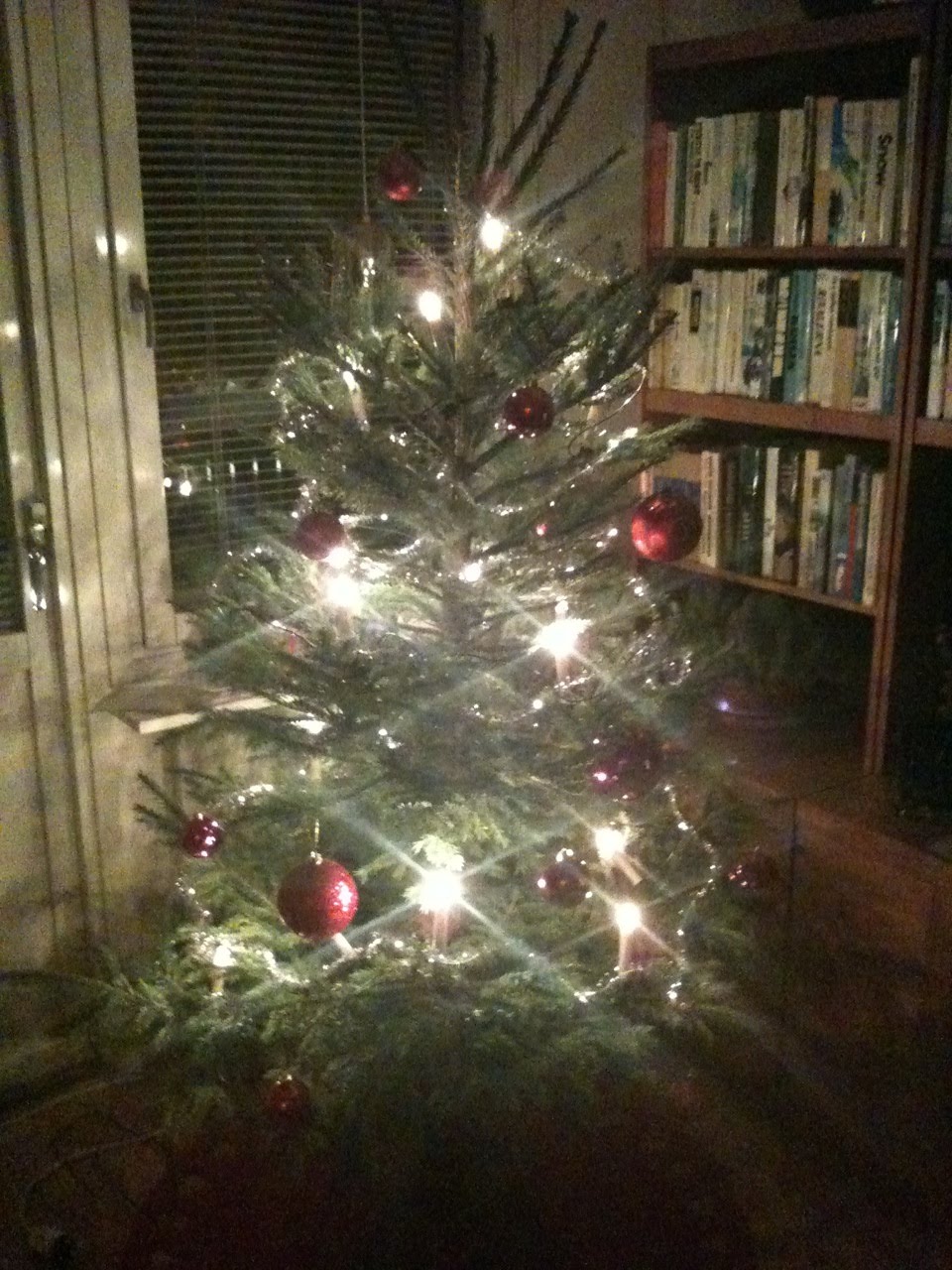 Så var jag hemma hos syrran i förrgår. De hade klätt iordning sin gran. Den var så fin. De hade fått den gratis i Vällingby C. Så när vi var där, syrran och jag, och råkade handla för 500kr så bestämde jag mig för att skita i förnuftet. Idag trotsade jag snöstormen och åkte och hämta en gratisgran. Svängde förbi Claes Ohlsson och köpte julgransfot, kulor, glitter och en matta. Och nu står den här. Med de gamla julgransljusen som jag köpte på loppis. Det är en viktig detalj. De nya ljusen som finns att köpa är inte lika bra. De bara är inte det. De har gjort några små förändringar som försämrar hela grejen.